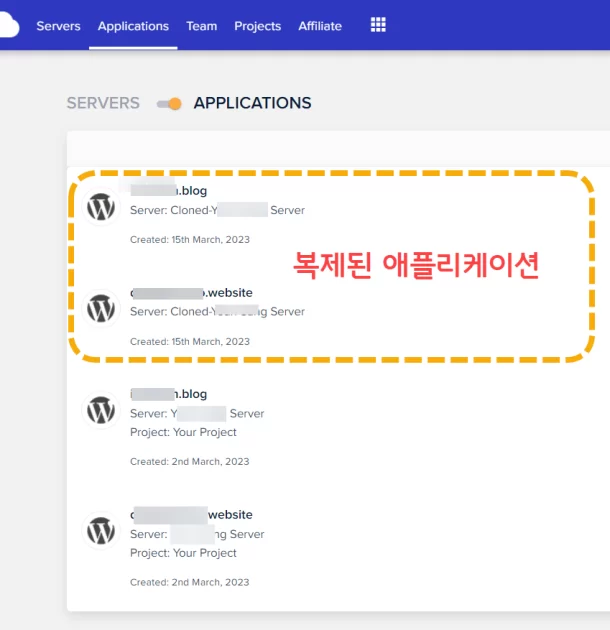 - 서버 복제가 완료되면 각 애플리케이션에 연결된 도메인을 복제된 서버에 지정하고 서버 IP 주소도 변경합니다.