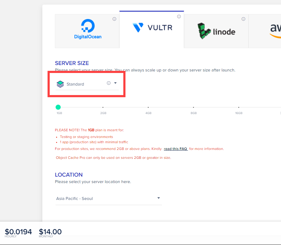 서울 리전은 Vultr와 AWS에서 선택할 수 있습니다. Vultr High Frequency 서버 타입을 선택했을 때 원하는 서버 크기에서 Seoul 리전을 사용할 수 없는 경우에는 High Frequency 대신 Standard 서버 타입을 선택하면 서울 리전을 선택할 수 있을 것입니다.