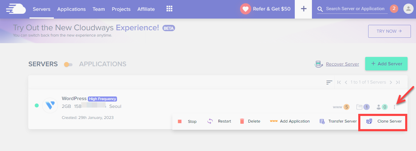 복제할 서버의 맨 오른쪽에 있는 세 개의 점으로 된 아이콘을 클릭하고 Clone Server(서버 클론)를 선택합니다.