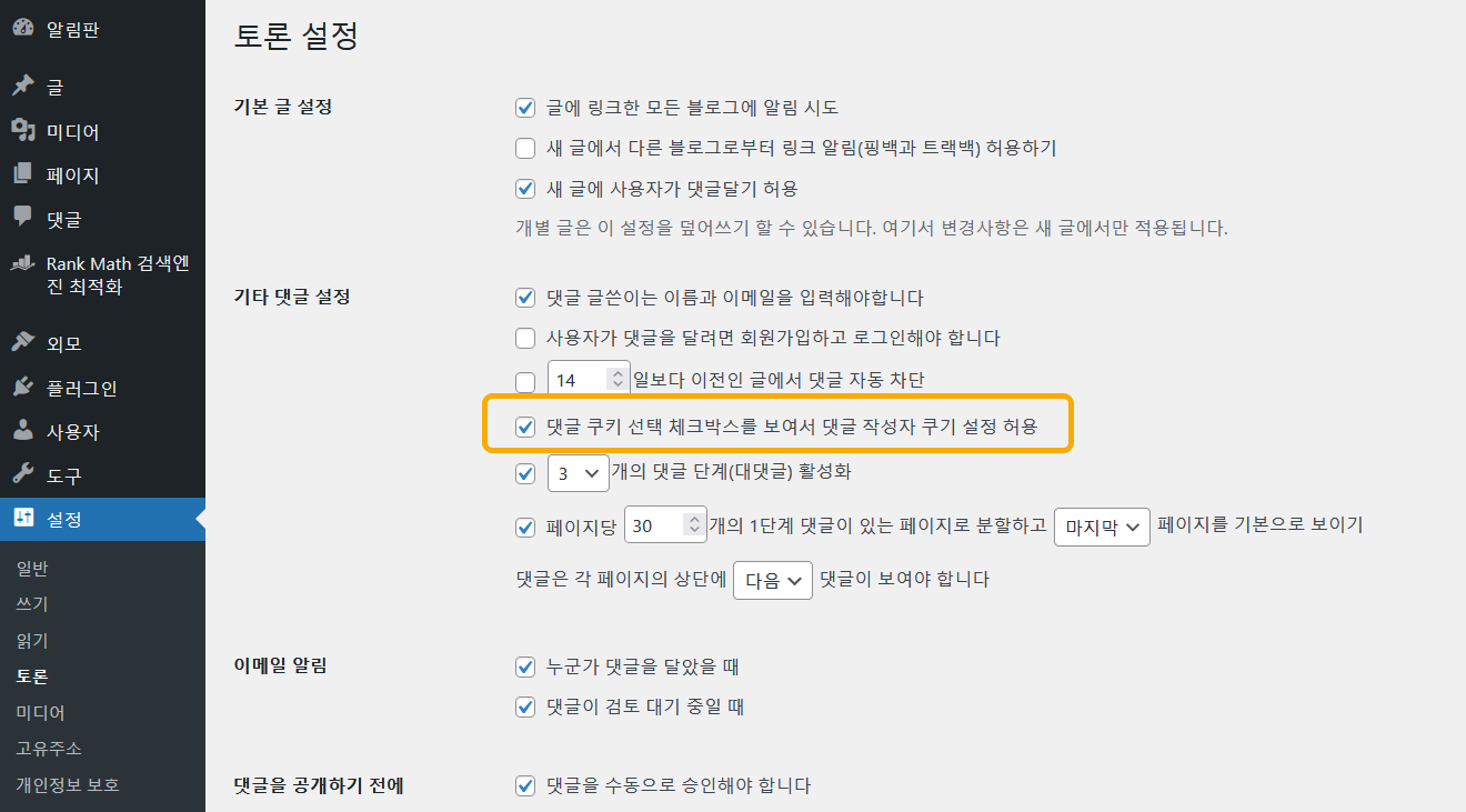 워드프레스 "다음 번 댓글 작성을 위해 이 브라우저에 이름, 이메일, 그리고 웹사이트를 저장합니다" 변경하기