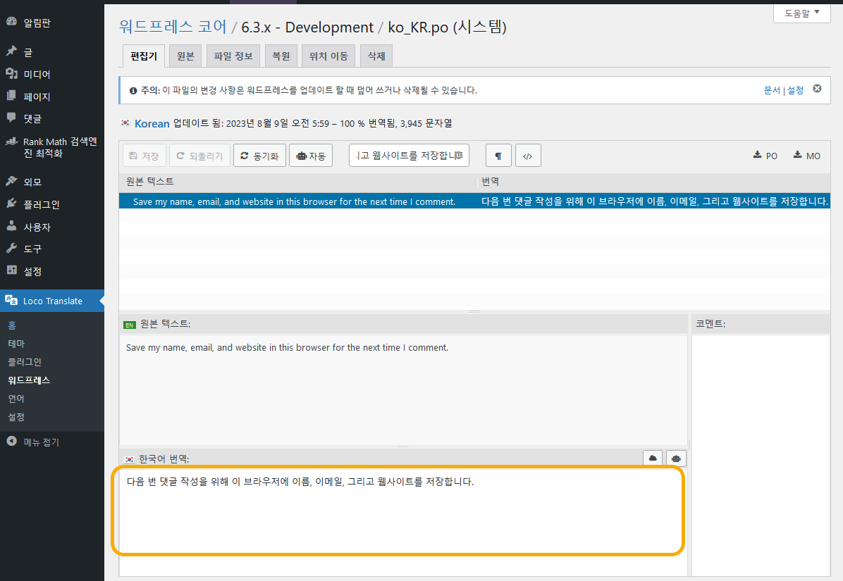 워드프레스 코어 파일 번역 화면에서 Save my name, email, and website in this browser for the next time I comment 문구를 찾아서 적절히 번역하도록 합니다.