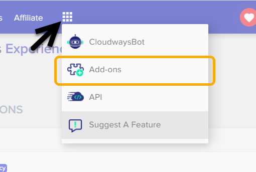 애드온은 상단의 바둑판 모양의 아이콘을 클릭하고 Add-ons를 클릭하여 확인할 수 있습니다.