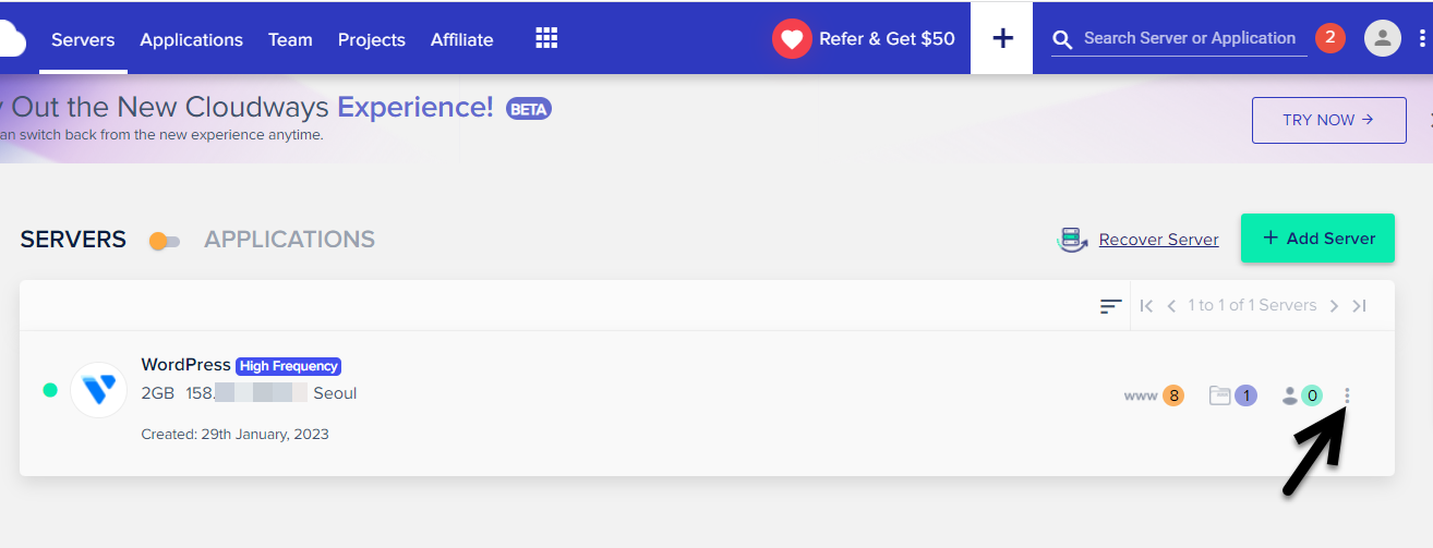 서버를 삭제하고 싶은 경우 상단 메뉴에서 Servers를 선택하여 서버 페이지로 이동한 후에 삭제할 서버의 맨 오른쪽의 세 점 아이콘을 클릭합니다.