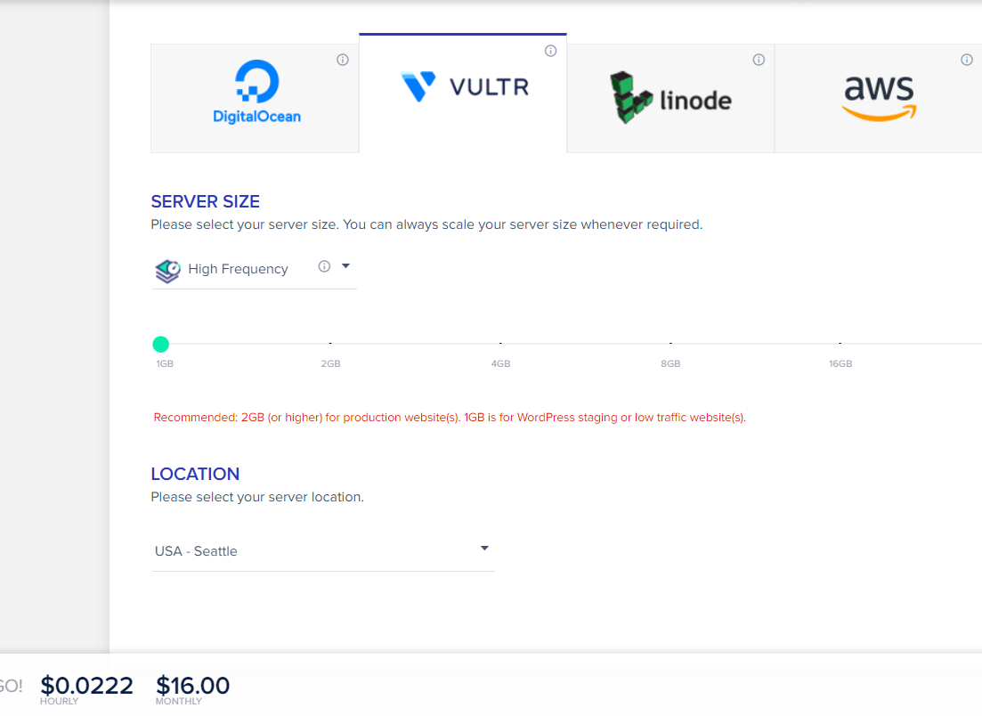 예를 들어, Vultr, High Frequency, 1GB 서버를 생성하면 매월 16달러의 비용이 청구됩니다. 만약 이러한 서버를 2개 생성하여 운영하면 월 32달러가 청구됩니다.