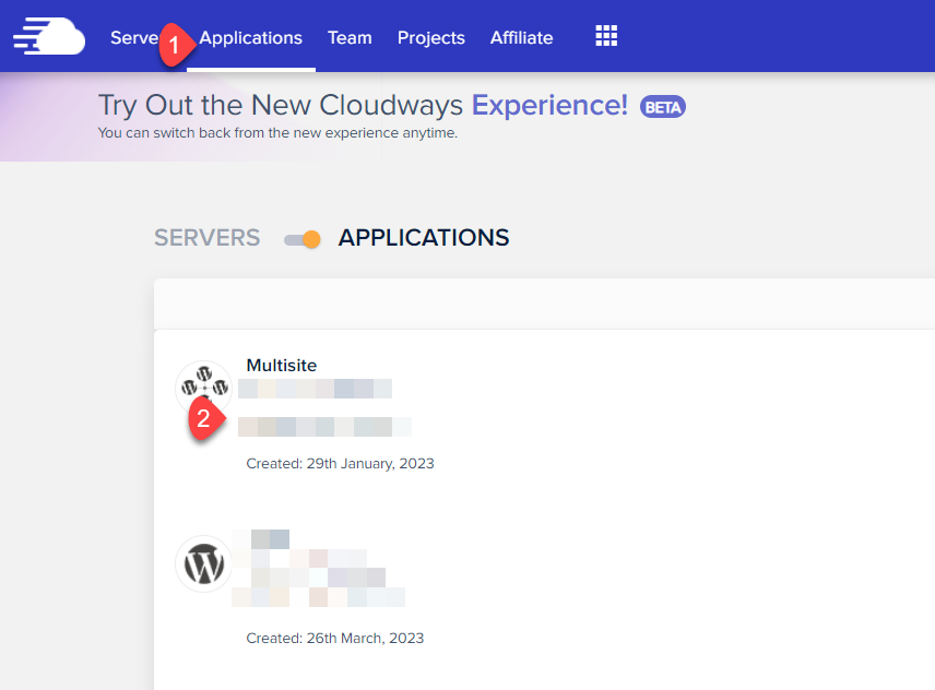 클라우드웨이즈에서 XML-RPC를 활성화하려면 클라우드웨이즈 계정에 로그인한 다음, 상단 메뉴에서 Applications를 클릭합니다.