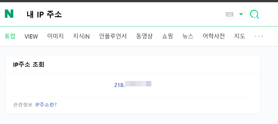 IP 주소는 네이버나 구글에서 "내 IP 주소"로 검색하여 확인할 수 있습니다. 가령, 네이버에서 "내 IP 주소"로 검색하면 다음 그림과 같이 내가 사용 중인 인터넷 회선의 공인 IP 주소(인터넷 업체가 사용자에게 할당하며 공유기가 인터넷과 통신하도록 하는 역할을 하는 외부 IP 주소)가 표시됩니다.