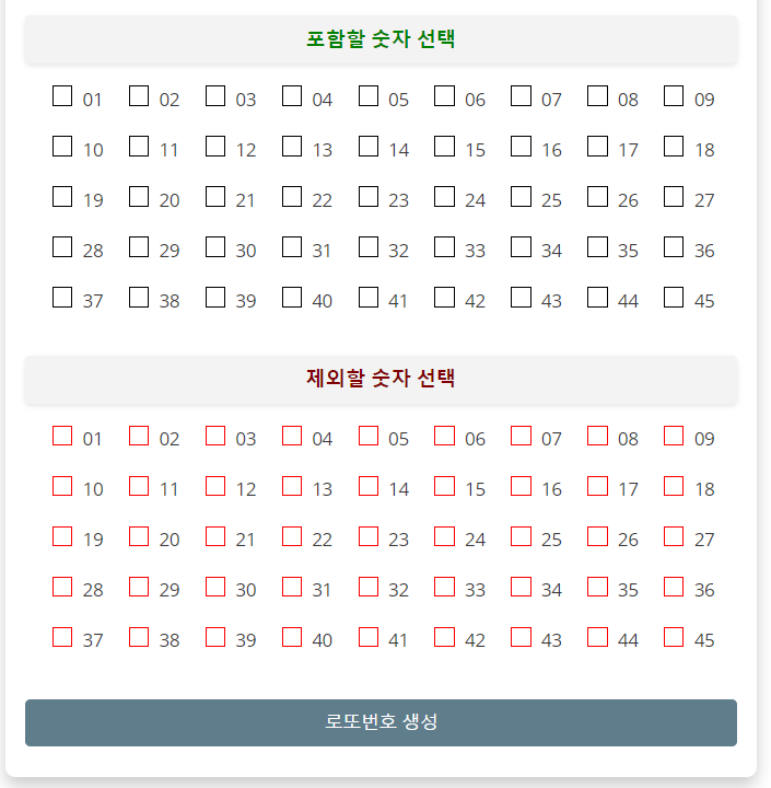 번호에 포함할 숫자와 제외할 숫자를 선택할 수 있도록 만들어 보았습니다.