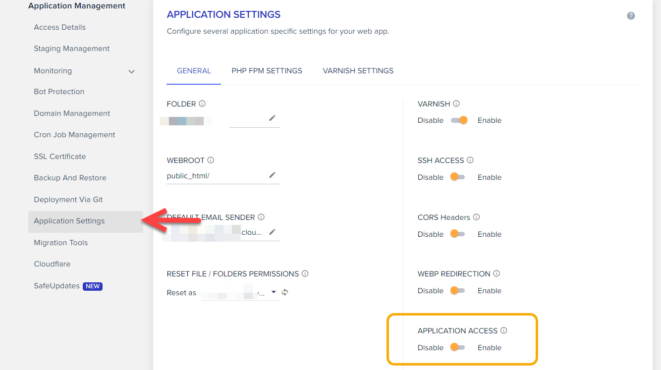 이 경우에는 Application Settings 메뉴를 클릭한 다음, Application Access 옵션이 Disable(비활성화)로 설정되어 있는지 체크합니다.