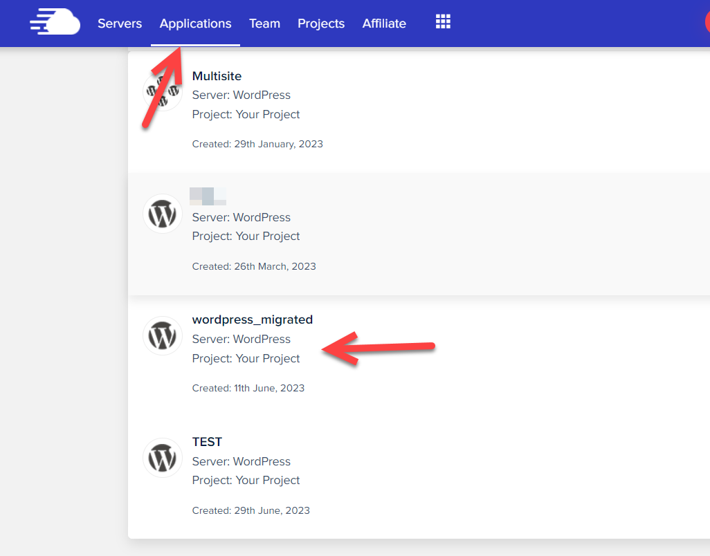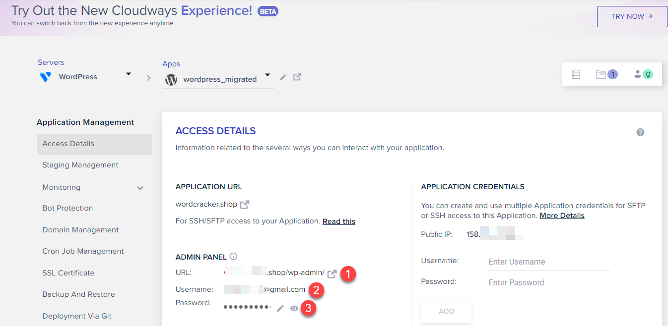 클라우드웨이즈(Cloudways)에 워드프레스를 설치하였다면 해당 애플리케이션을 선택하여 애플리케이션 관리 페이지로 이동합니다.