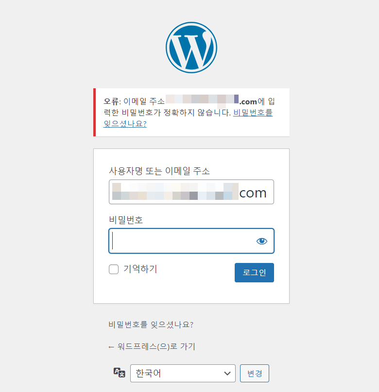 워드프레스 관리자 페이지에 접속은 가능하지만 아이디/비밀번호 입력 시"이메일 주소 example@naver.com에 입력한 비밀번호가 정확하지 않습니다" 등과 같이 인증 오류가 발생한다면 입력한 정보가 올바른지 체크하도록 합니다.