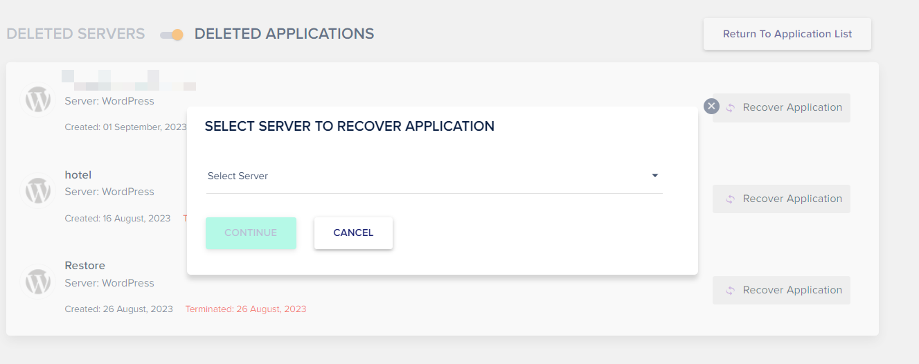 클라우드웨이즈(Cloudways)에서는 하나의 서버 내에 여러 개의 애플리케이션(워드프레스 등)을 설치하여 운영할 수 있습니다. 서버나 애플리케이션을 삭제하면 15일 이내에 복원이 가능합니다. 다만, 서버나 애플리케이션이 적어도 한 번 이상은 백업이 되어 있어야 합니다. 이전에는 Cloudways에 연락해야 복원이 가능했지만 지금은 사용자들이 직접 복구할 수 있습니다.