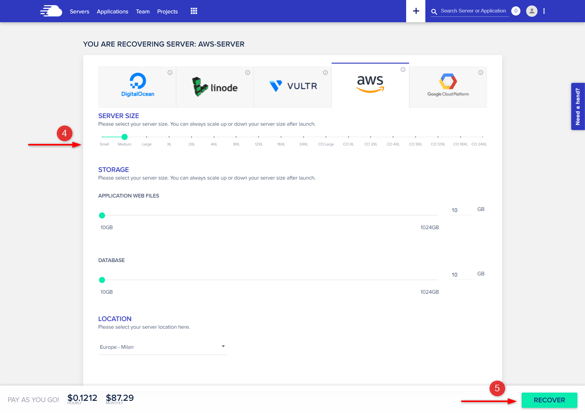 여기에서 클라우드 제공자, 서버 크기, 애플리케이션 웹 파일 및 데이터 기본 크기(AWS 및 GCP에 해당), 서버 지역 등과 같은 서버 사양을 변경할 수 있습니다.