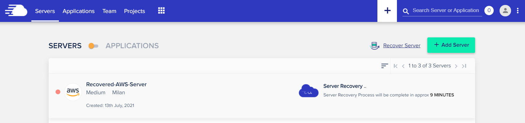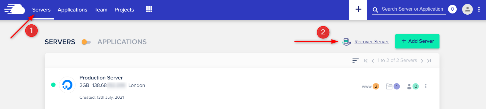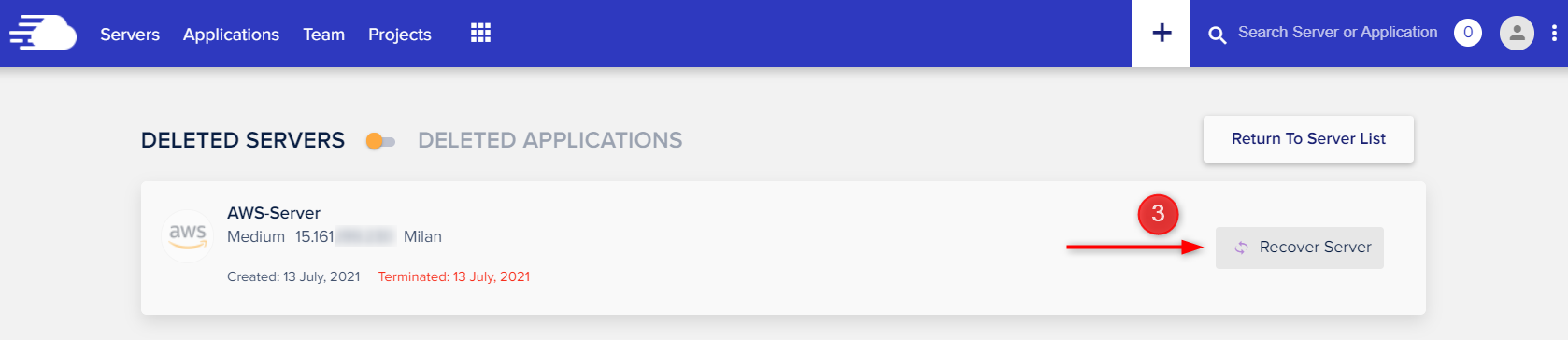삭제된 서버를 복원하려면 Servers 메뉴를 누르고 Recover Server를 클릭합니다.
